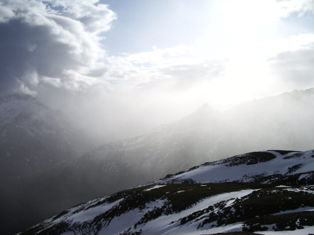 Dann zog sich die Wolkendecke wieder zu. Als Jonson die Sichtkante erreicht hatte regnete es schon eine Zeitlang. Von hier aus konnte er bis zum Talboden herunter sehen, der noch fünfhundert Meter tiefer lag. Es gab zwar keine Felsen und keine Steilwand, die seinen Weg erschwerten, aber die Bergwiese ging sehr steil herab, und war sehr glitschig. Jonson setzte sich einfach hin, und rutschte auf seinem Allerwertesten ein Stück die Wiese herunter. Nach ein paar Metern kam eine Art Stufe, und Jonson mußte wieder aufstehen, zwei Schritte gehen, und sich wieder hinsetzen und auf dem Hosenboden die Wiese herunterrutschen. Das ging ziemlich lange so weiter, und war sehr mühselig. Nach zwei sich wirklich sehr in die Länge ziehenden Stunden erreichte Jonson, noch immer auf seinen vier Buchstaben rutschend, den Talgrund. Der Regen wurde noch stärker. Es gab wirklich gar Nichts, was irgendwie Schutz bot. Nur diese Wiese, und drumherum die Berge. Nicht mal einen Felsen neben den man sich kauern konnte. Das Ende der Wiese konnte Jonson in ein bis zwei Kilometern Entfernung sehen. Dort endete das Tal, und die Bergwände vereinigten sich. Durch die Wiese floß ein beachtlicher Bach, den Jonson leider überqueren mußte, da natürlich nur auf der anderen Seite Möglichkeiten zum Weiterkommen vorhanden waren. Diesseits des Baches lagen etwas tiefer leider unwegsame Steilstufen. Also versuchte Jonson irgendwie, den sich zehn Meter breit, ohne erkennbares Flußbett, über die Wiese ergießenden Bach zu überqueren. Das war eine matschige nasse Angelegenheit und das am gefühlt absoluten Ende der Welt. Der Bach schien sich nicht wirklich auf seine zehn Meter Breite begrenzen zu wollen. Überall stand immer mal wieder etwas Wasser auf der Wiese, und Jonson begann sich Sorgen um einen trockenen Zeltplatz zu machen. Mittlerweile wurde es Zeit dafür, denn die Abenddämmerung war schon fast vorbei. Das fiel nicht besonders auf, weil es schon seit Stunden sehr dunkel durch die Wolken war. Nach längerem Suchen entschied Jonson sich für ein kleines Stück, vermeintlich grüner Wiese, umgeben von lauter Wasser. Pfützen, die so vor sich hin plätscherten. Er baute sein Zelt auf, kochte sich etwas zu Essen, machte Tee, und versuchte sich im Regen eine Zigarette zu drehen. Irgendwann kroch er in seinen Schlafsack. Von außen prasselte der Regen gegen sein Zelt. Tief beeindruckt schlief er ein.