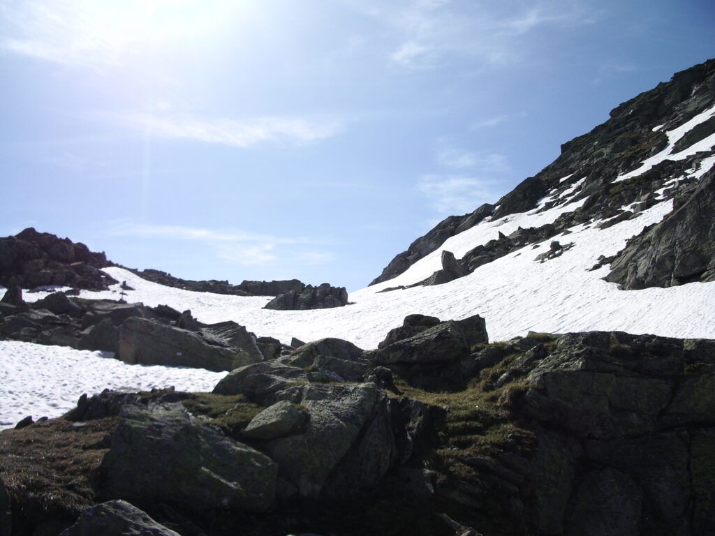 Während Jonson den Berg herunter ging, kam das Geröll in Bewegung. Erst ein paar kleine Steine, dann auch Größere, rollten abwärts. Zum Glück kein wirklich gefährlicher Steinschlag. Nur das der Untergrund begann, sich in das Tal zu bewegen. Und das mit einer Geschwindigkeit, die höher war, als Jonson laufen konnte. Das unter seinen Füßen nachgebende Geröll riß ihn von den Beinen. Jonson wurde unkontrolliert mitgerissen, und bergab transportiert. Er rutschte auf dem Rücken liegend immer tiefer herunter, bis seine Füße auf einen festsitzenden Stein trafen, und seine Rutschpartie beendet wurde. Jetzt ein etwas größerer Stein von hinten auf seinen Kopf, und es wäre aus gewesen. Aber zum Glück passierte nichts weiter. Das Geröll rieselte noch etwas weiter herab, um dann ruhig liegen zu bleiben. Geschockt, aber auch erleichtert rappelte Jonson sich auf. Ach so, deswegen soll man nicht hier lang gehen, dachte er, und ging weiter. Einen richtigen Weg gab es auch nicht. Zumindest führte keiner dahin, wo Jonson hin wollte. Der normale Wanderweg ging oben auf dem Kamm weiter, von dem Jonson durch diese Schotterrinne abgebogen war, und führte in das gegenüberliegende Tal mit einem kleinen Ort. Aber dorthin wollte Jonson nicht. Weit unter seinen Füßen, auf dieser Seite der Gebirgskette lag ein sehr abgelegenes Seitental, ohne jegliche Infrastruktur. Scheinbar unbenutzt. Nichtmal eine Alm, oder deren Überreste gab es dort. Obwohl der Talboden von prächtigen Wiesen bedeckt war. Nebulöse Erzählungen über diese Gegend und sein Verlangen nach Einsamkeit führten Jonsons Weg genau in dieses abgelegene Tal. Weg? Das war ja nun der Falsche gewesen. Dabei war ihm doch von alten Jäger- und Schmugglerpfaden berichtet worden, die in sein Tal führen sollten. Meine Pfadfinderischen Fähigkeiten muß ich wohl nochmal überdenken, dachte Jonson. Er blieb stehen, und sah sich um.